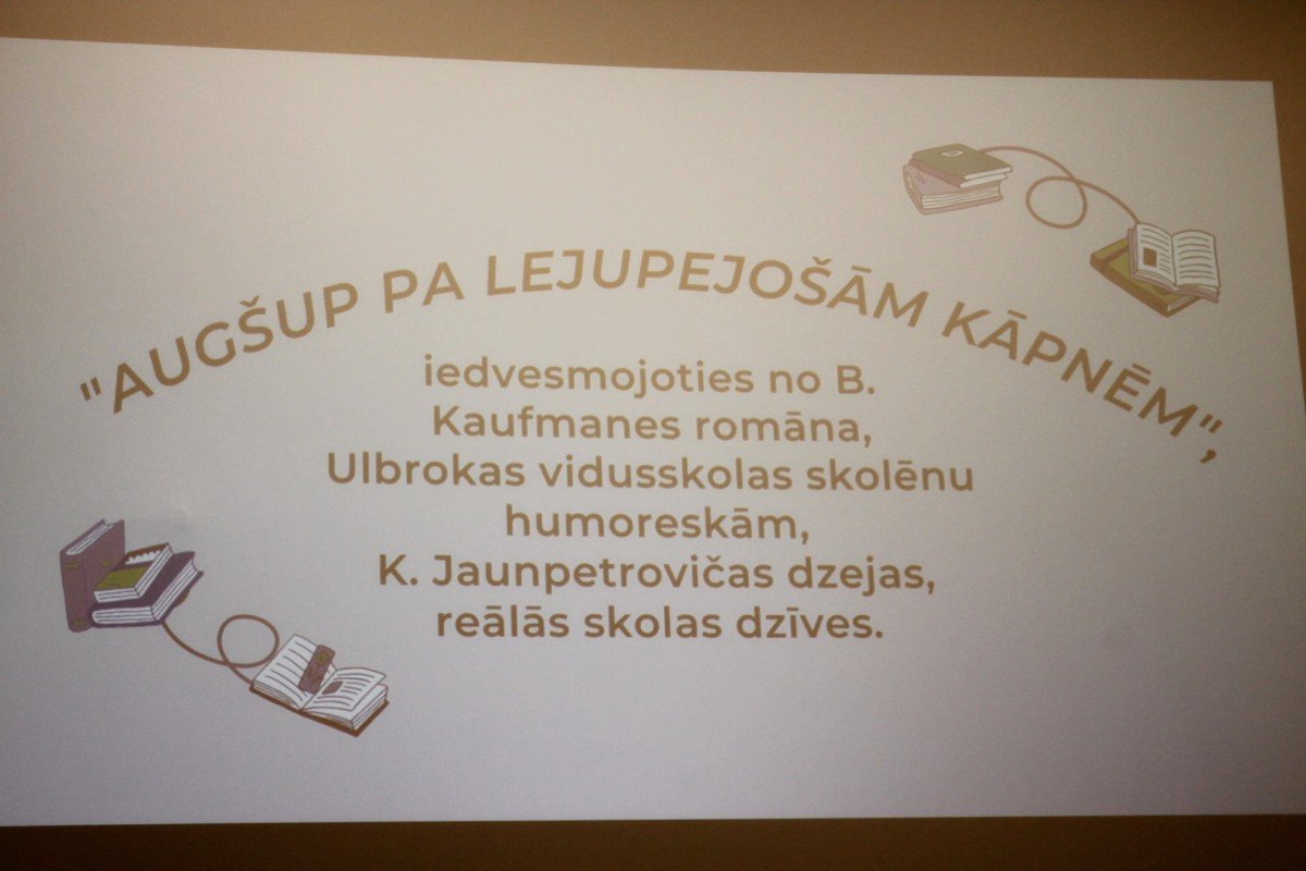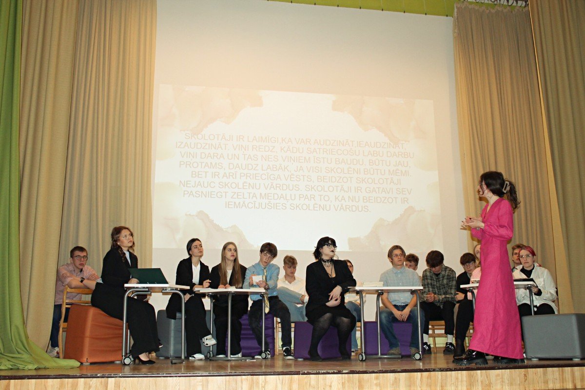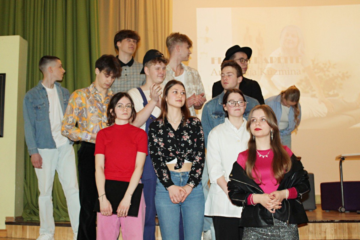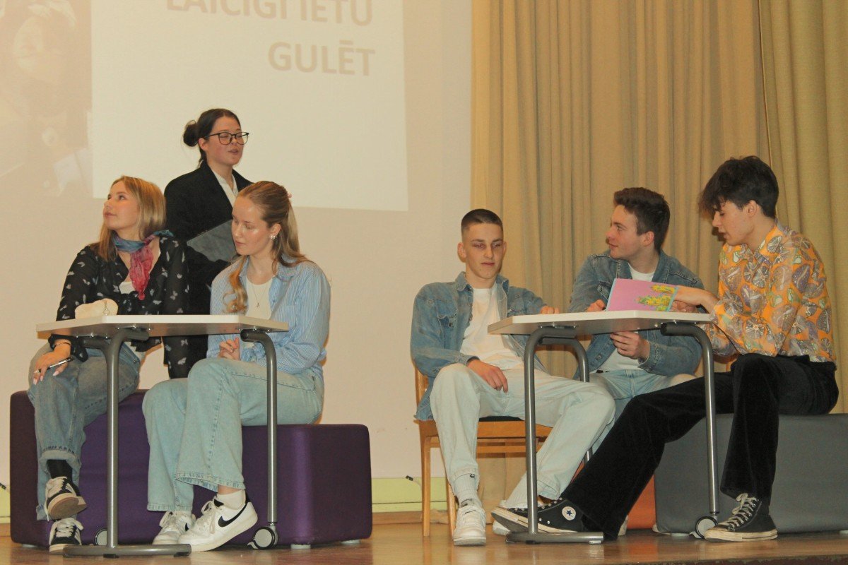 Lai saņemtu skolas simbolu - žetonu, 22.martā 12.a un b klases apvienojās un kopā parādīja darbu, kas tapis pēc Bellas Kaufmanes darba "Augšupa pa lejupejošām kāpnēm" motīviem. Izrādes beigās, ievērojot skolas tradīcijas, viņi kopā ar skolotāju Inesi Puhovu, dziedāja "Lilioma dziesmu", bet uz svinīgo žetonu saņemšanu, zālē ienāca ar polonēzi.