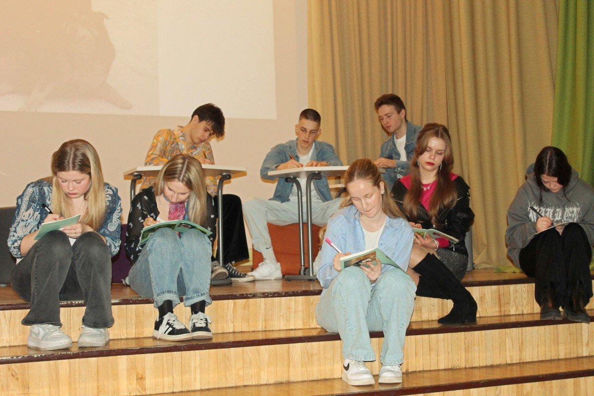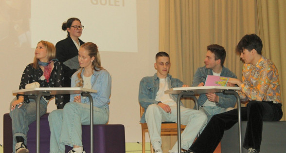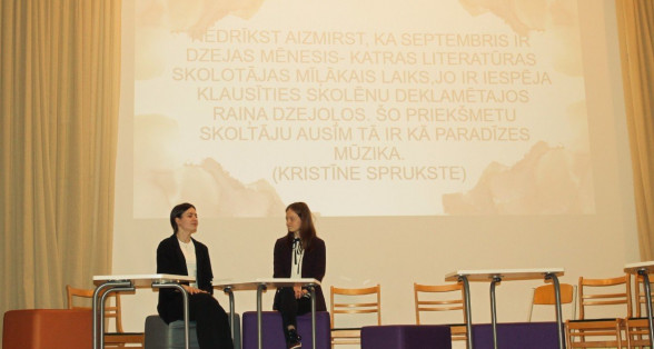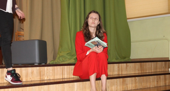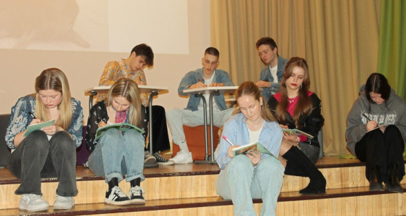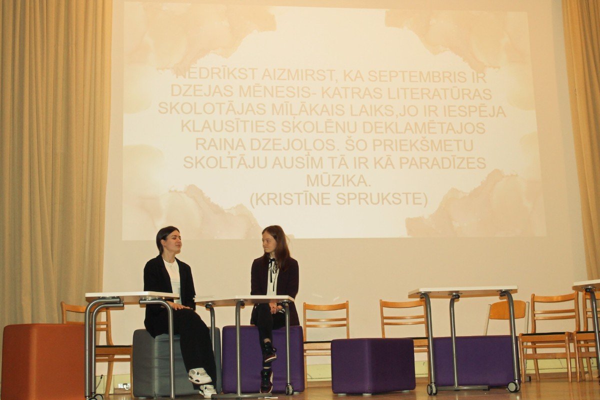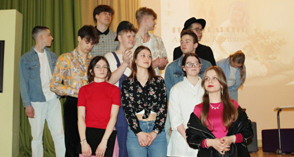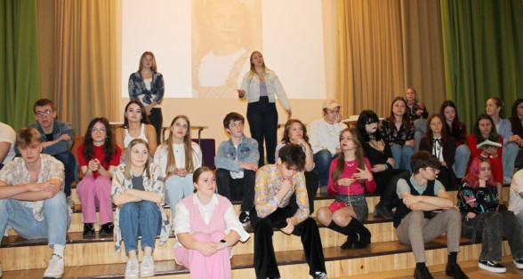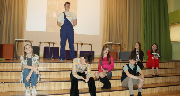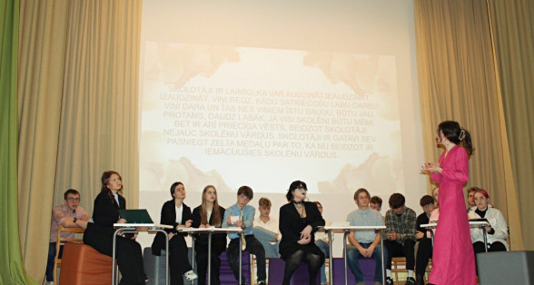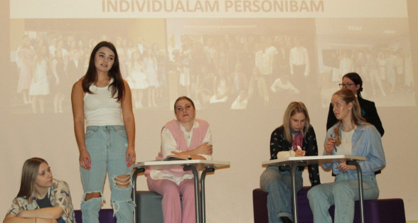 Lai saņemtu skolas simbolu - žetonu, 22.martā 12.a un b klases apvienojās un kopā parādīja darbu, kas tapis pēc Bellas Kaufmanes darba "Augšupa pa lejupejošām kāpnēm" motīviem. Izrādes beigās, ievērojot skolas tradīcijas, viņi kopā ar skolotāju Inesi Puhovu, dziedāja "Lilioma dziesmu", bet uz svinīgo žetonu saņemšanu, zālē ienāca ar polonēzi.