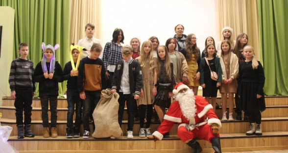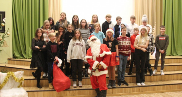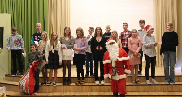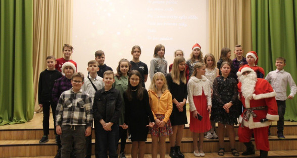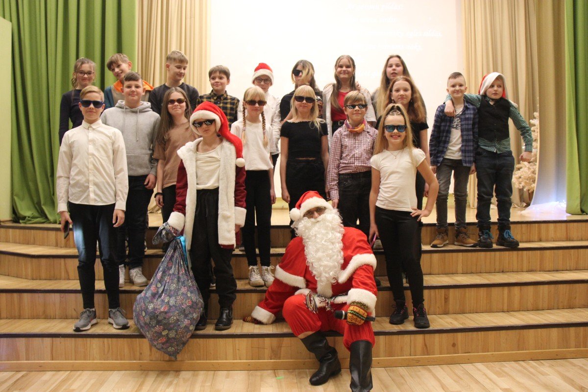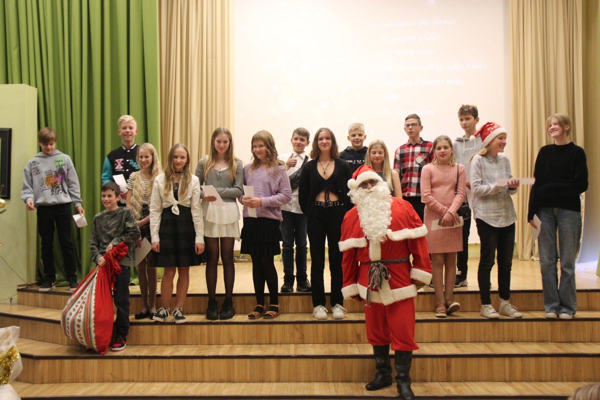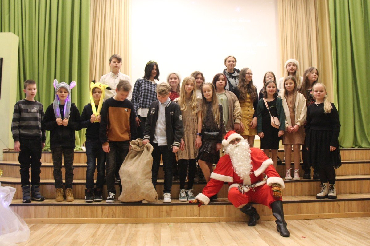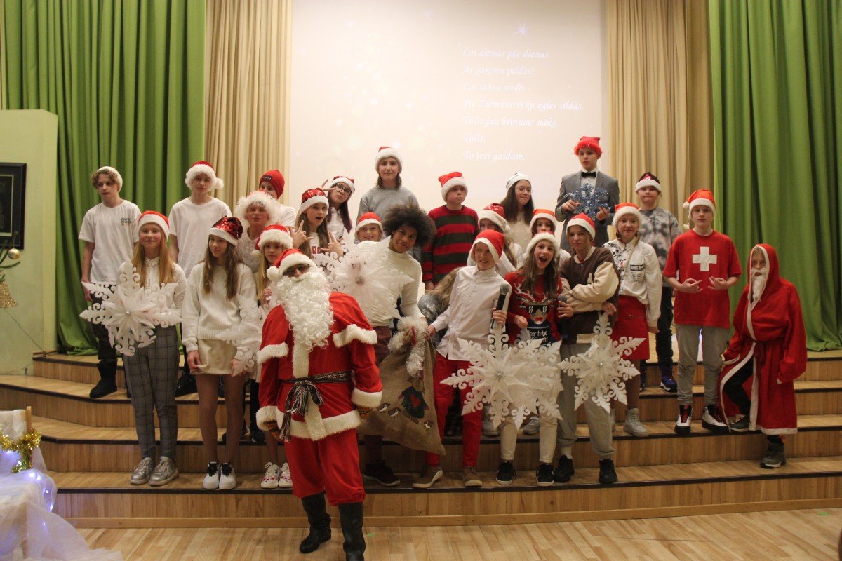 Skolas Svētku zālē Ziemassvētkus svin 5.-7.klases. Kā jau tas pienākas katram ģimenes loceklim, - katra klase sagatavojusi savu priekšnesumu. Un, protams, ir atnācis Ziemassvētku vecītis.
