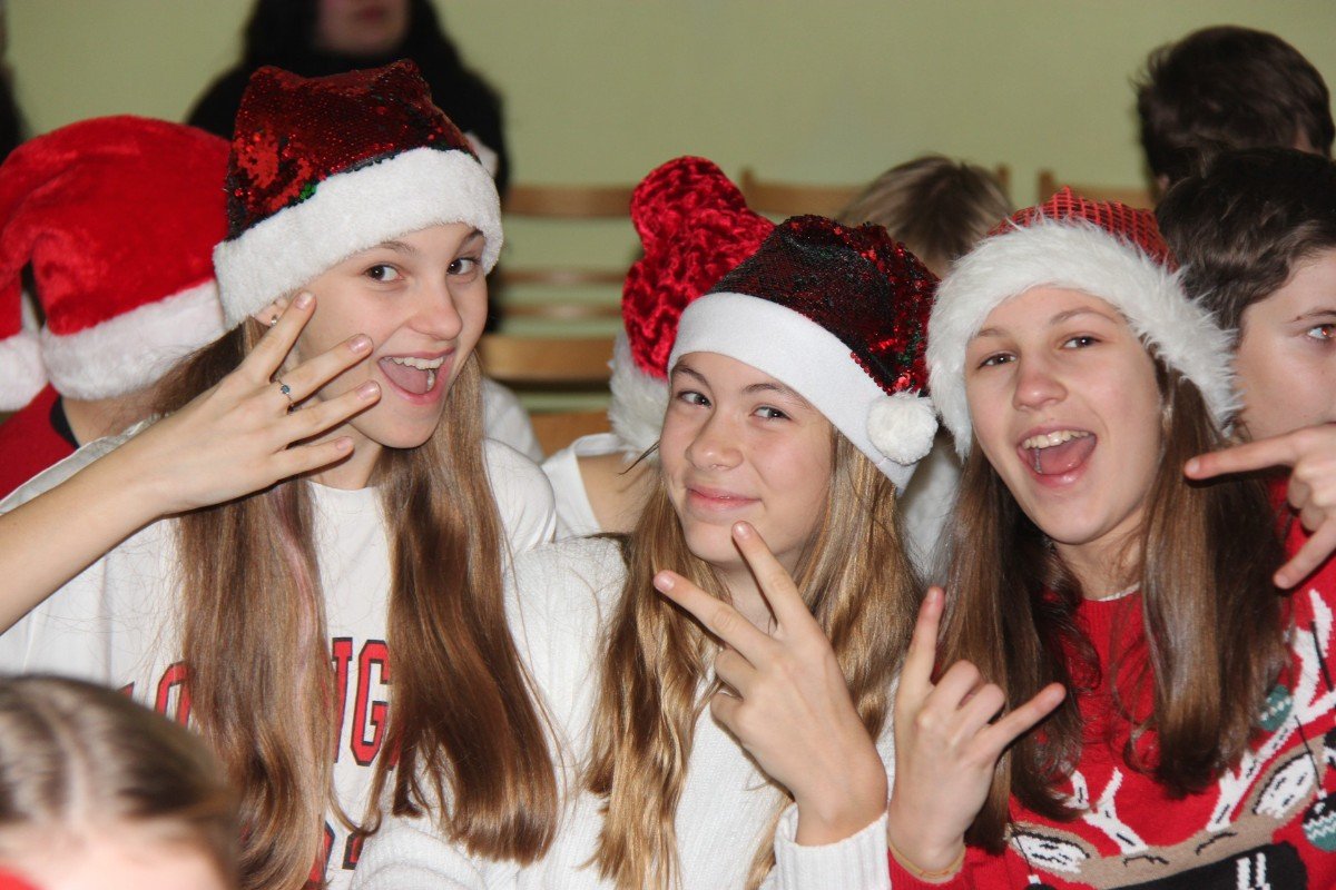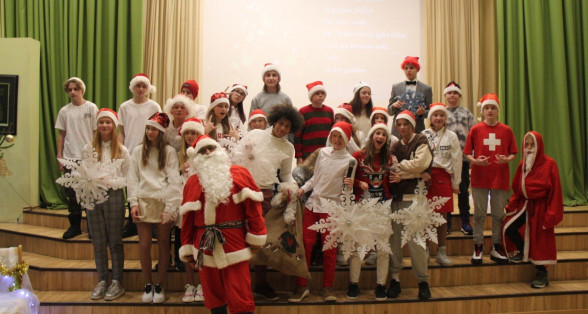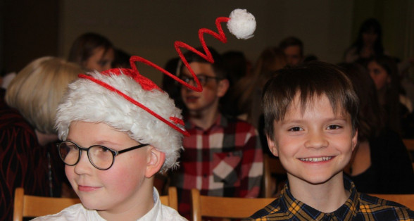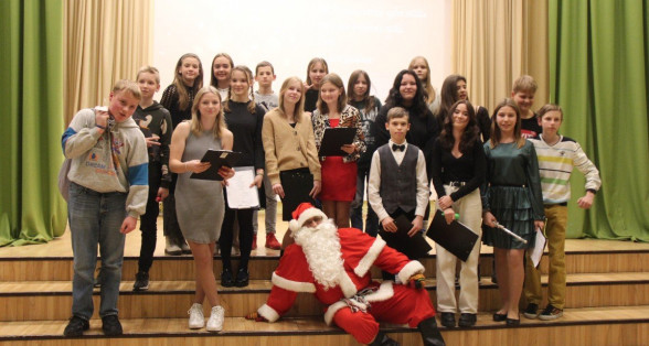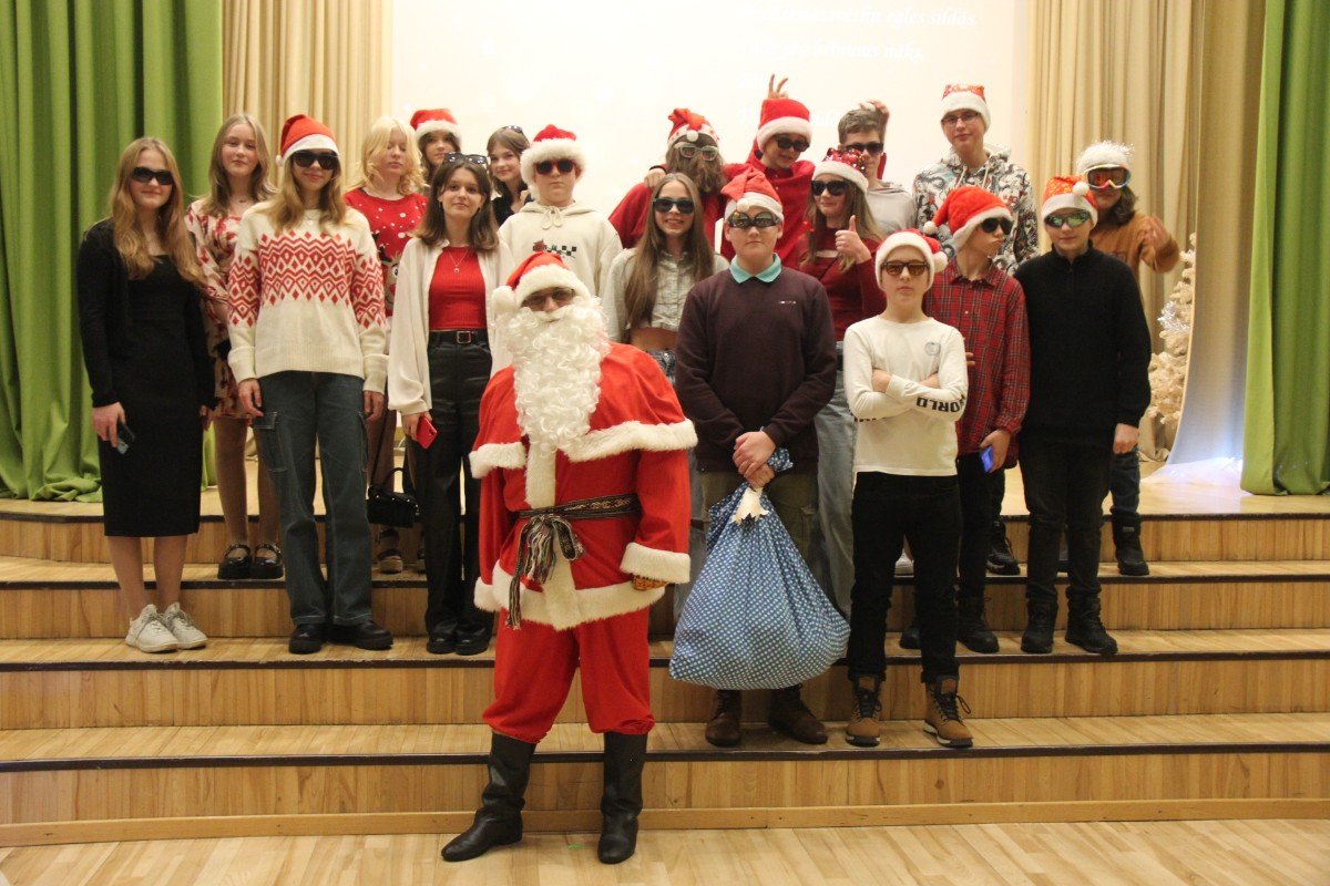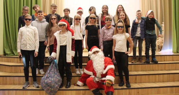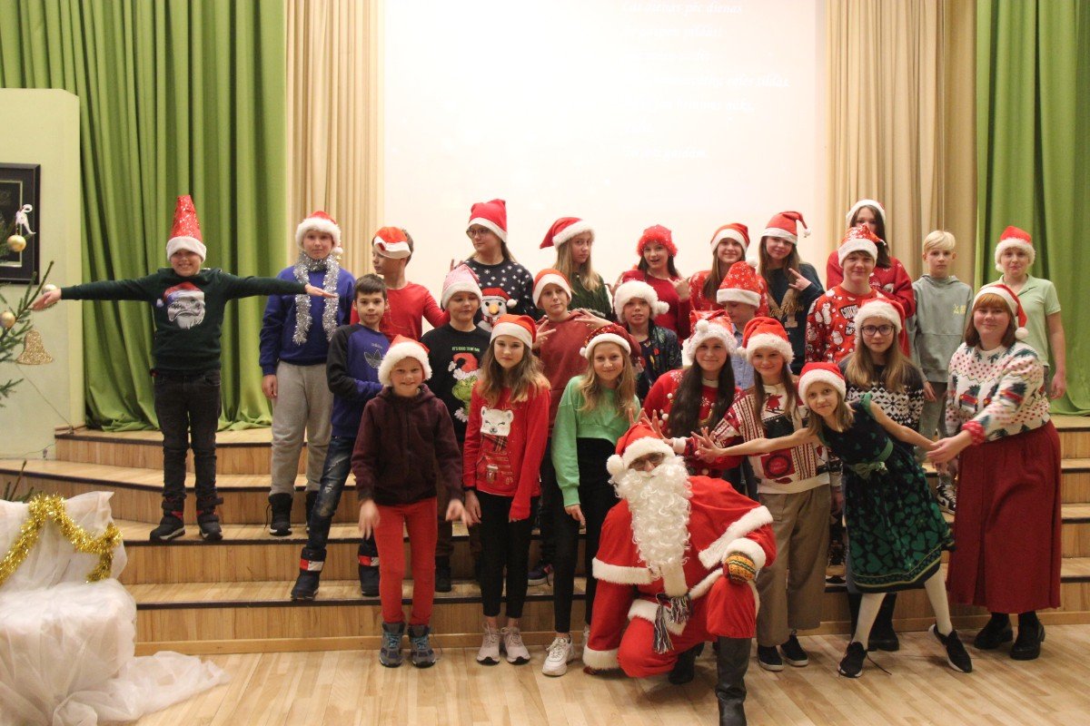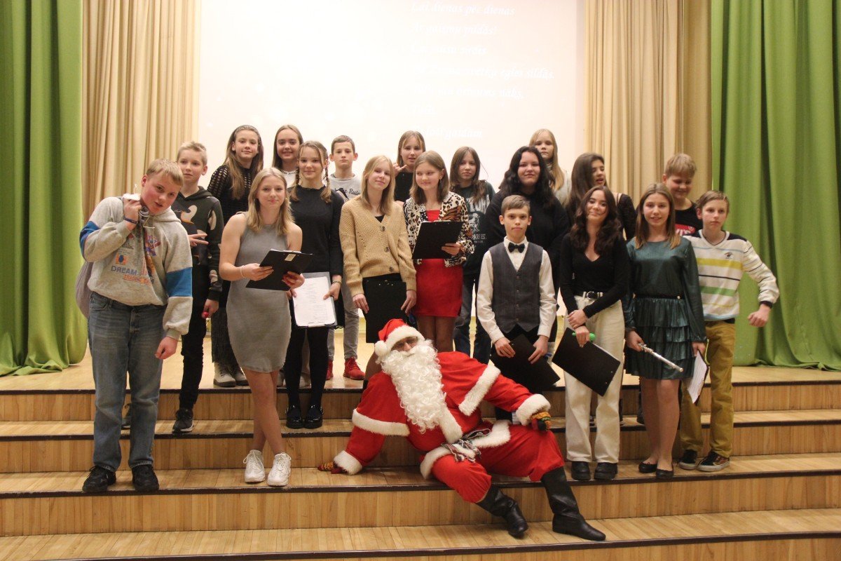 Skolas Svētku zālē Ziemassvētkus svin 5.-7.klases. Kā jau tas pienākas katram ģimenes loceklim, - katra klase sagatavojusi savu priekšnesumu. Un, protams, ir atnācis Ziemassvētku vecītis.