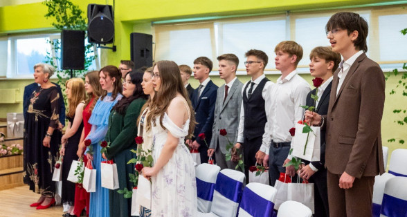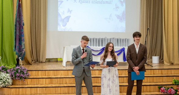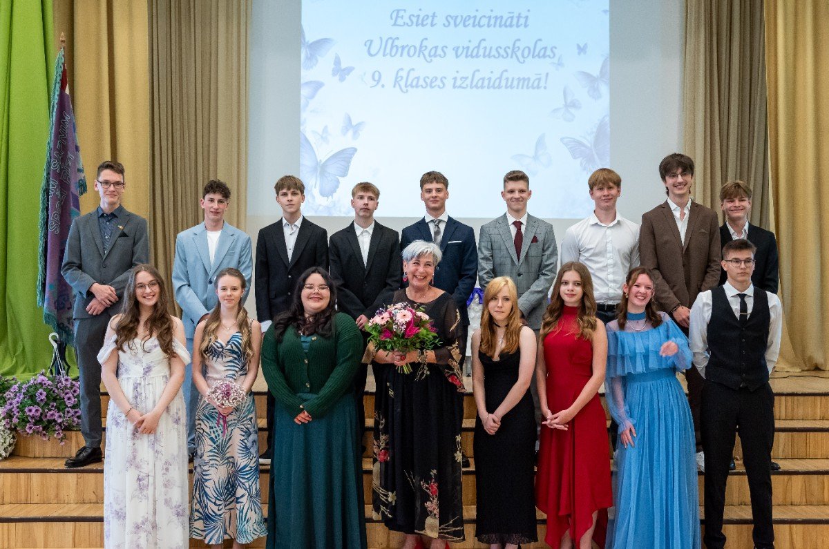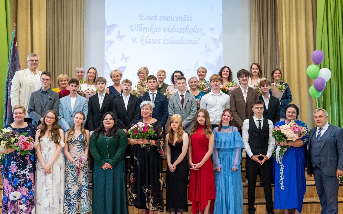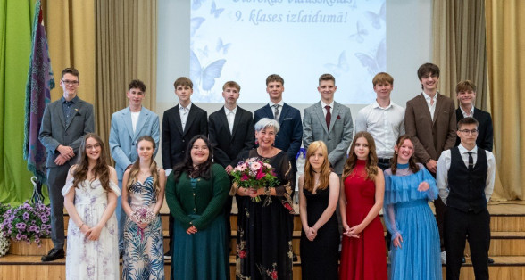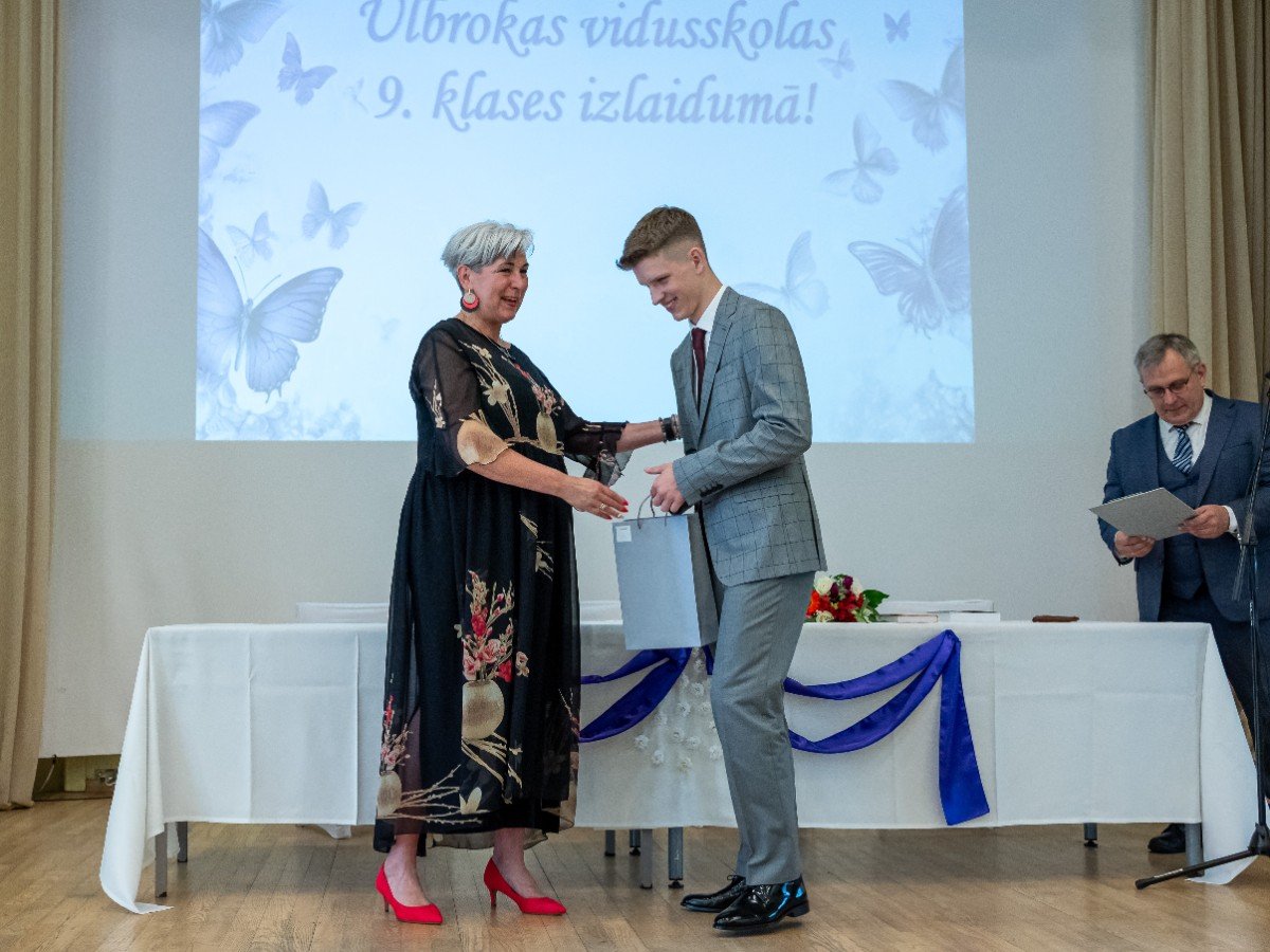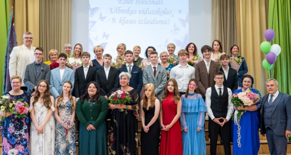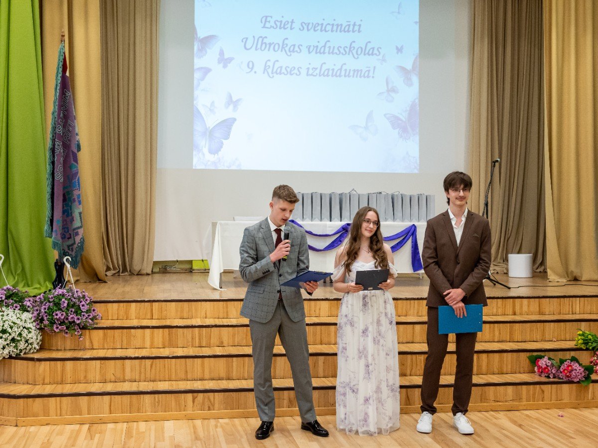 Izlaidumu diena Ulbrokas vidusskolā turpinās. Direktors Normunds Balabka un klases audzinātāja Inga Vereba uz svētku pasākumu ieved 9.b klases skolēnus.
