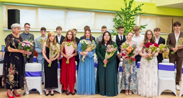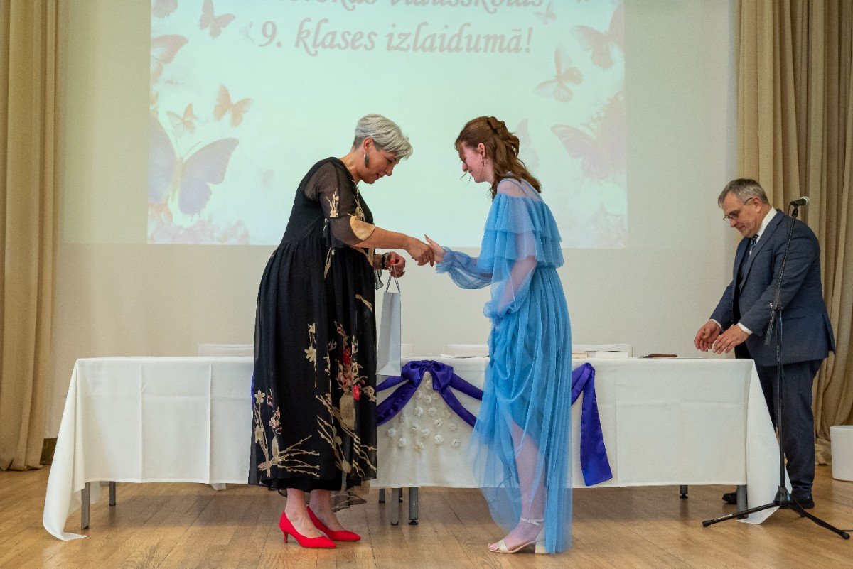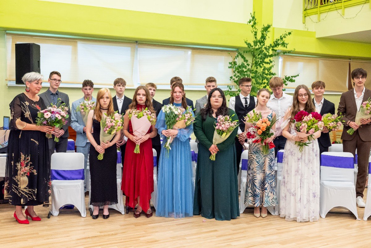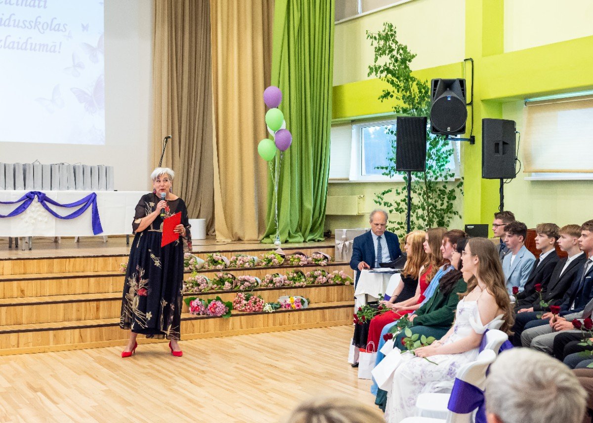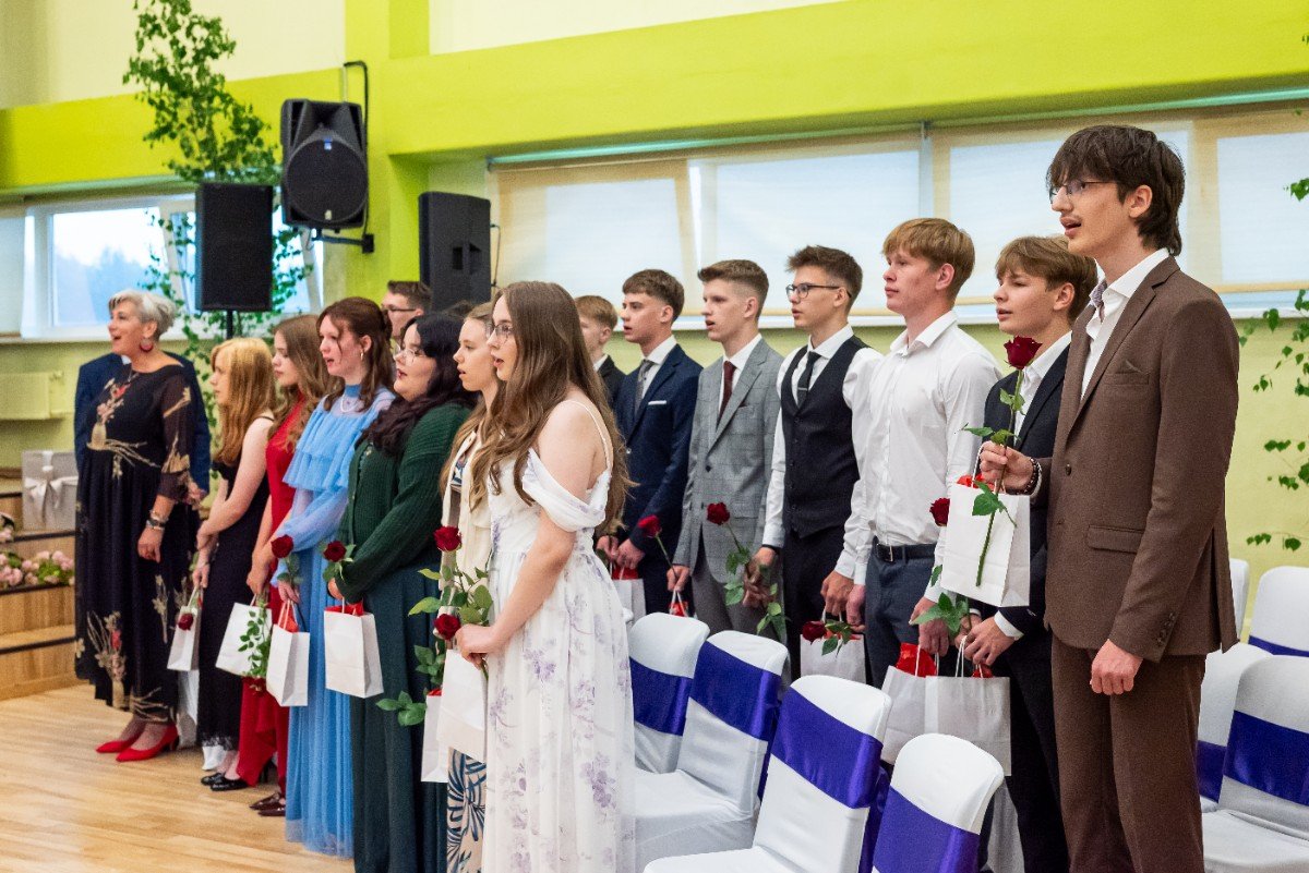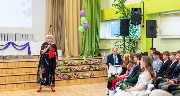 Izlaidumu diena Ulbrokas vidusskolā turpinās. Direktors Normunds Balabka un klases audzinātāja Inga Vereba uz svētku pasākumu ieved 9.b klases skolēnus.