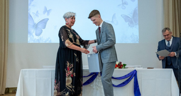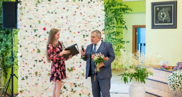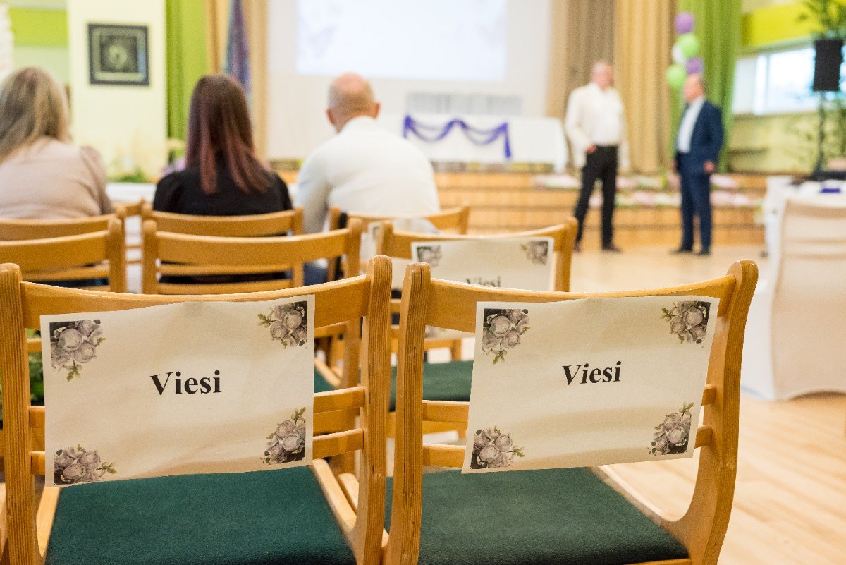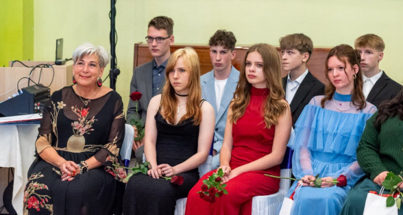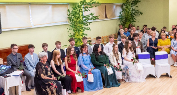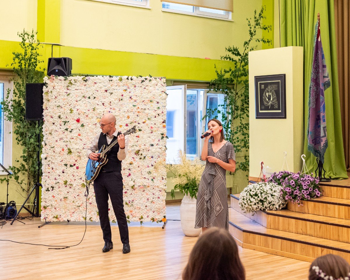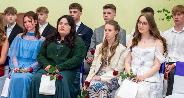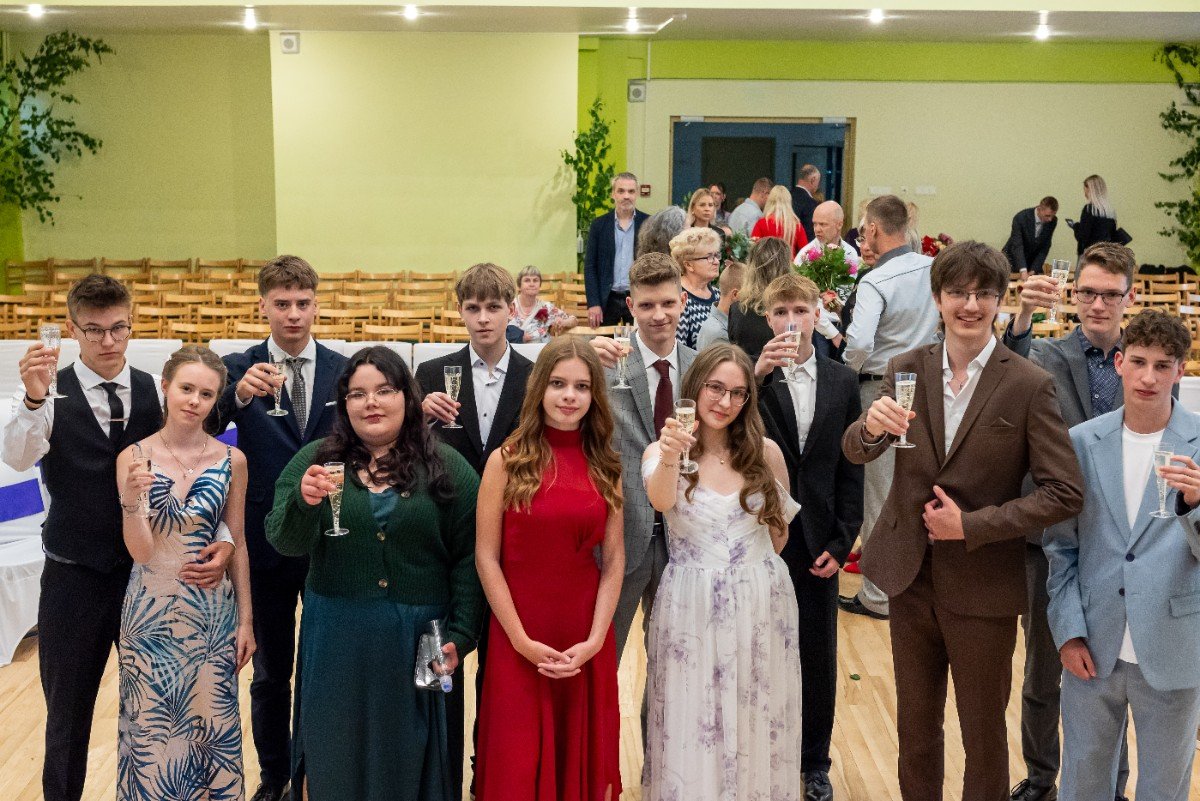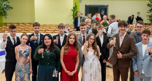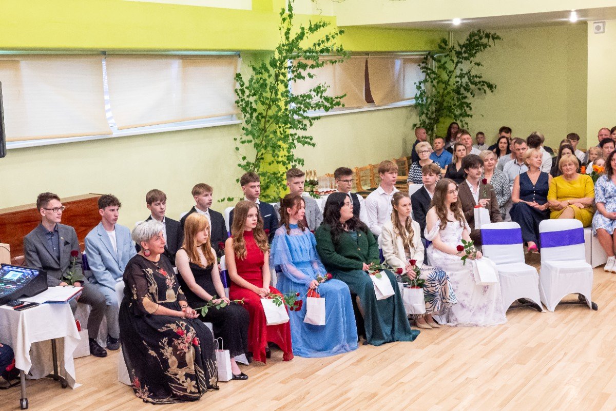 Izlaidumu diena Ulbrokas vidusskolā turpinās. Direktors Normunds Balabka un klases audzinātāja Inga Vereba uz svētku pasākumu ieved 9.b klases skolēnus.
