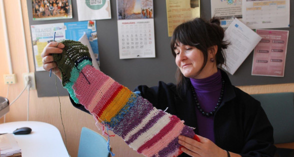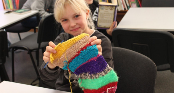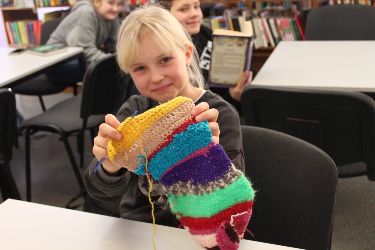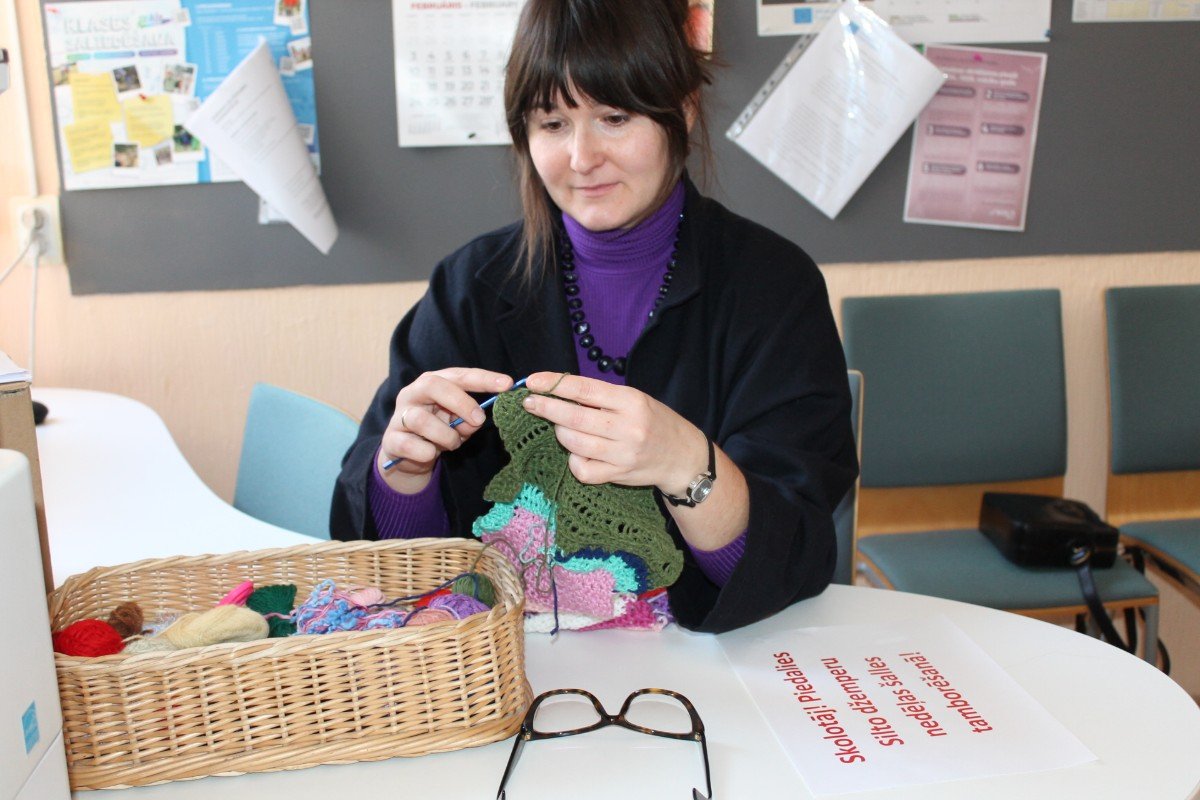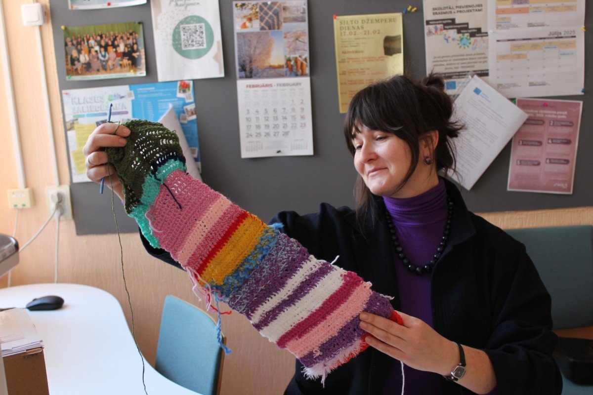 Visu šo nedēļu brīvos brīžos skolā tamborēja. Gan skolēni, gan skolotāji. Pēc Ulbrokas Ekopadome aicinājuma silto džemperu nedēļā top šalles. Skolotājiem - sava, skolēniem - sava.