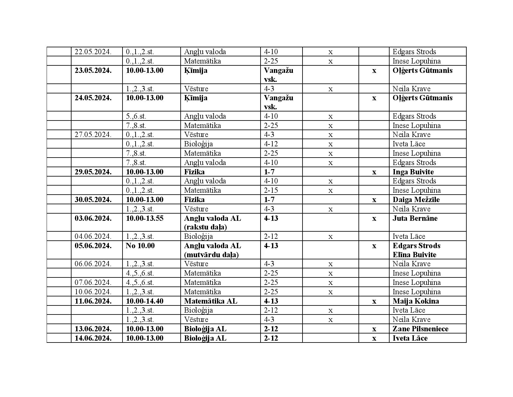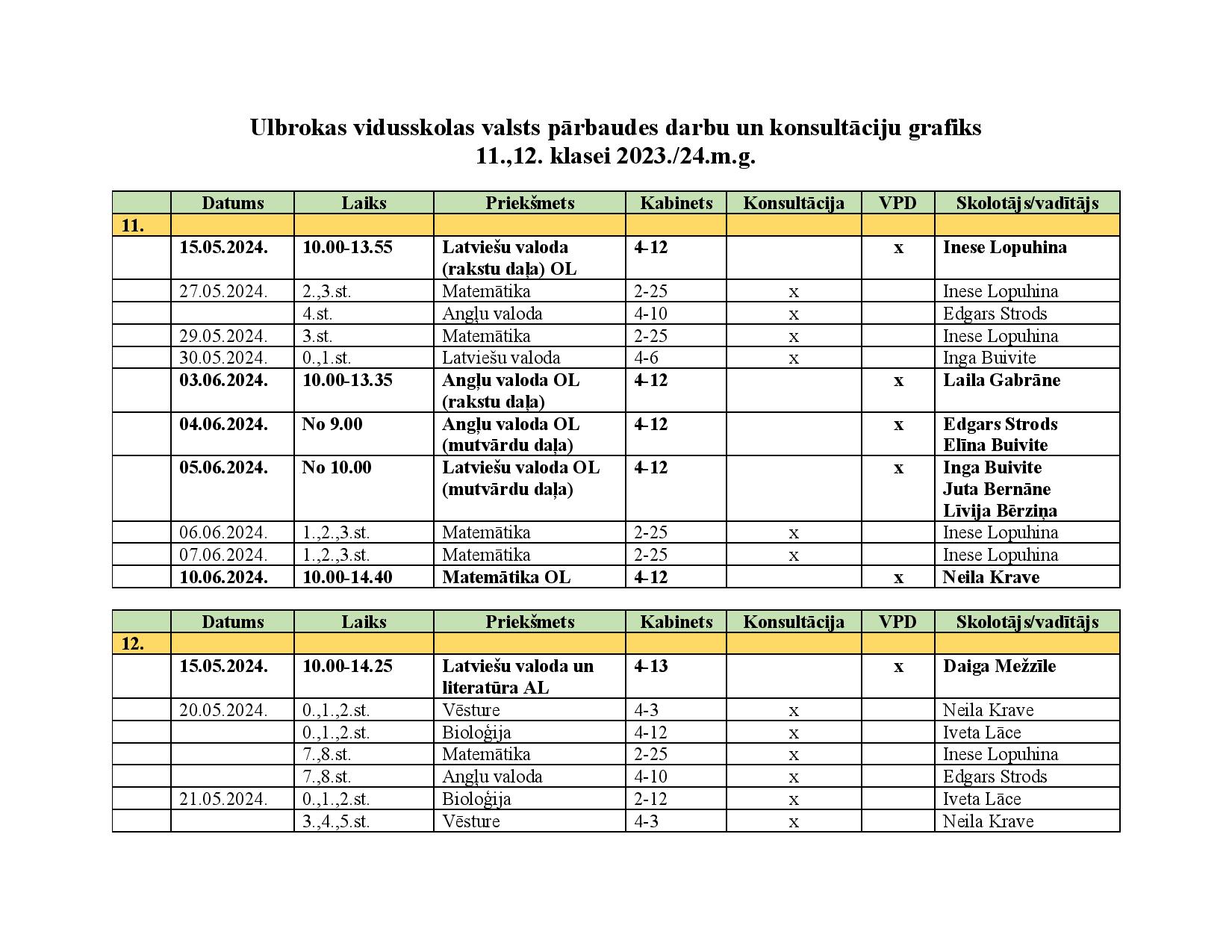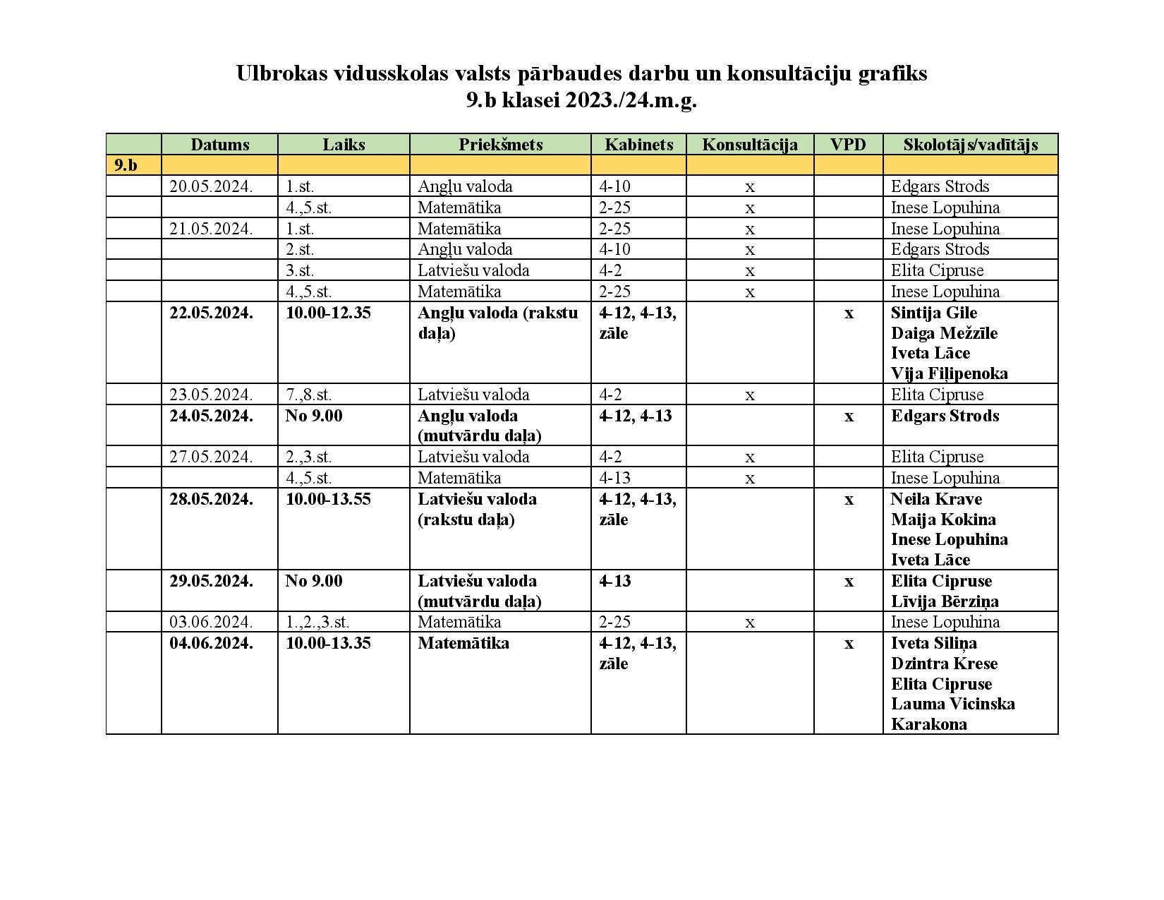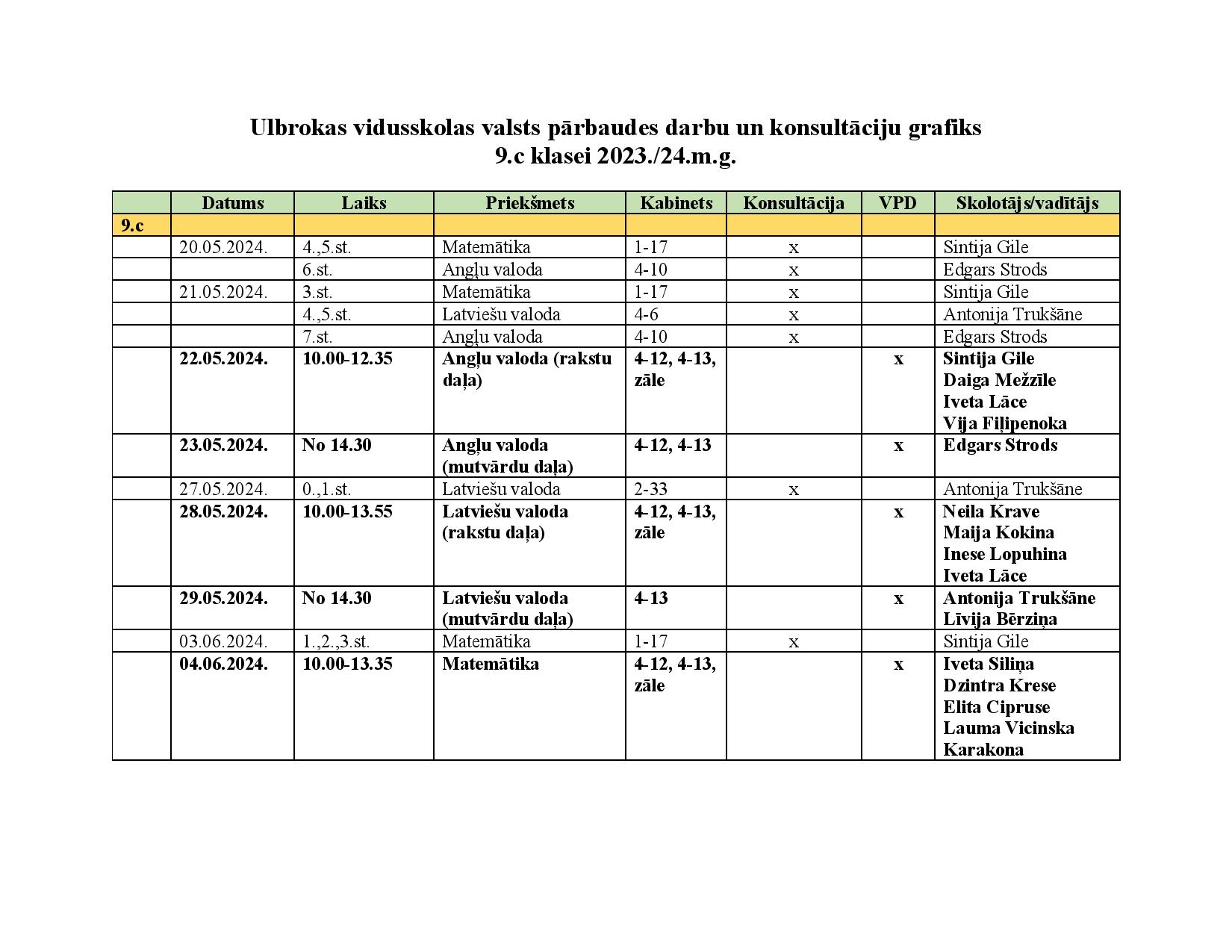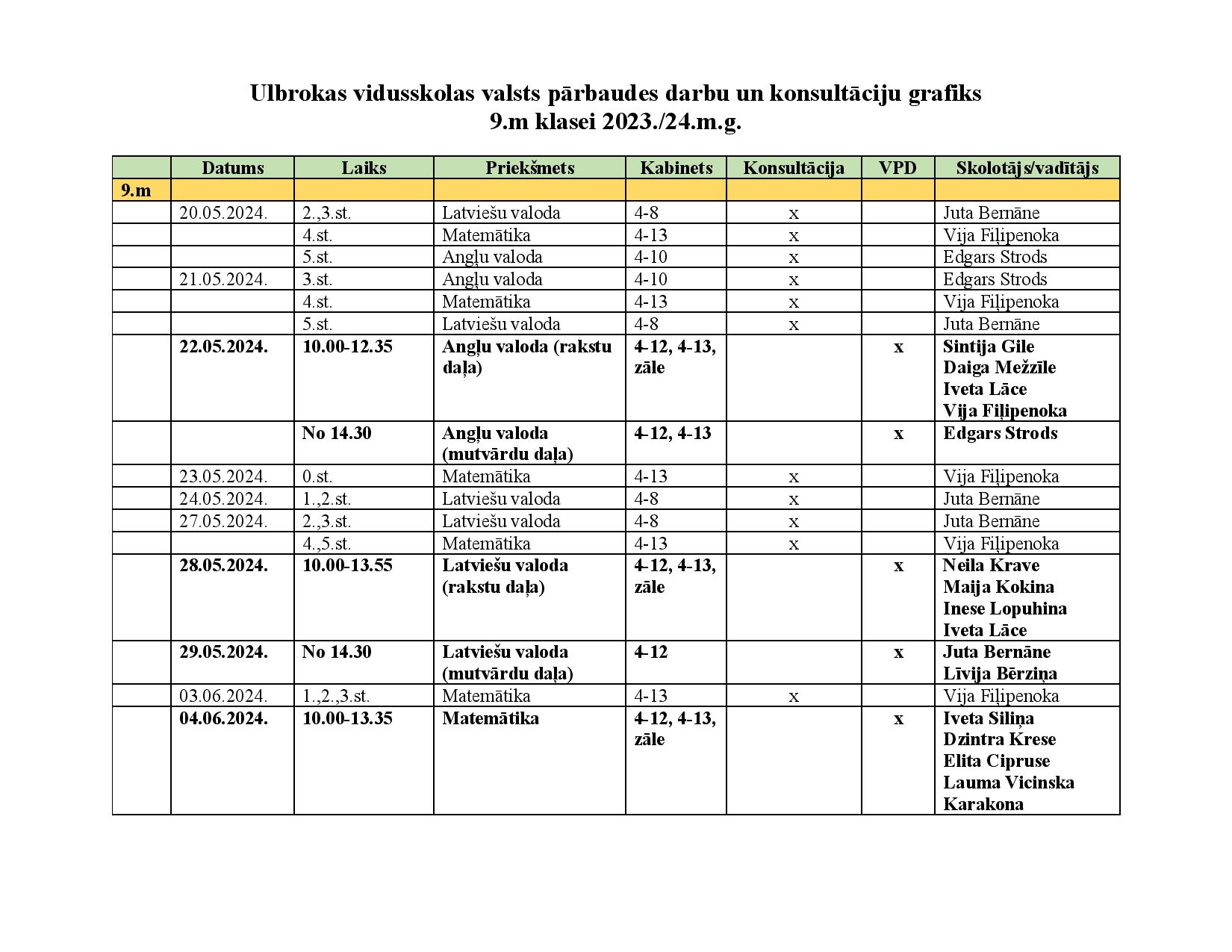 Konsultāciju un valsts pārbaudes darbu grafiks 9., 11. un 12. klasēm