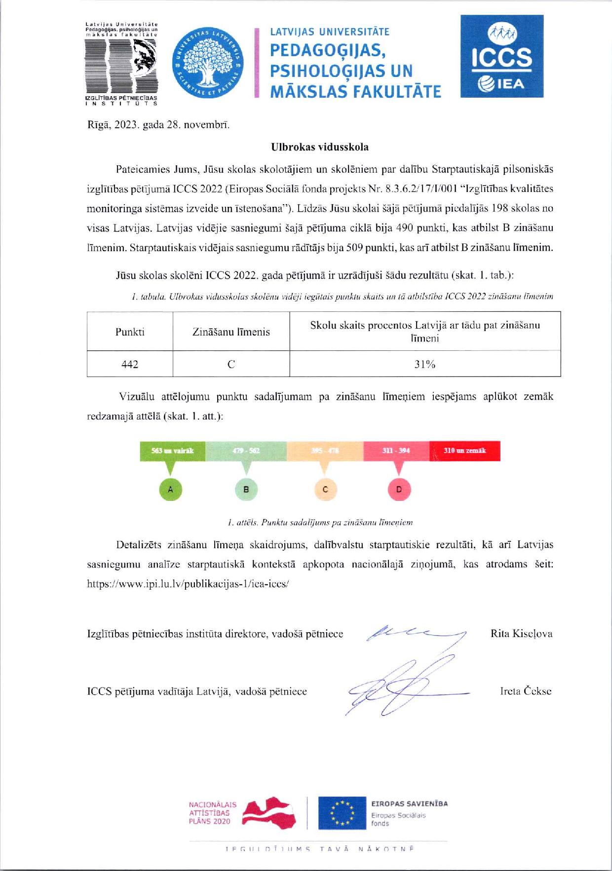 "Pateicamies Jums, Jūsu skolas skolotājiem un skolēniem par dalību Starptautiskajā pilsoniskās izglītības pētījumā ICCS 2022. Līdzās Jūsu skolai šajā pētījumā piedalījās 198 skolas no visas Latvijas. Latvijas vidējie sasniegumi šajā pētījumu ciklā bija 490 punkti, kas atbilst B zināšanu līmenim. Starptautiskais vidējais sasniegumu rādītājs bija 509 punkti, kas arī atbilst B ināšanu līmenim," teikts saņemtajā rezultātu ziņojumā.