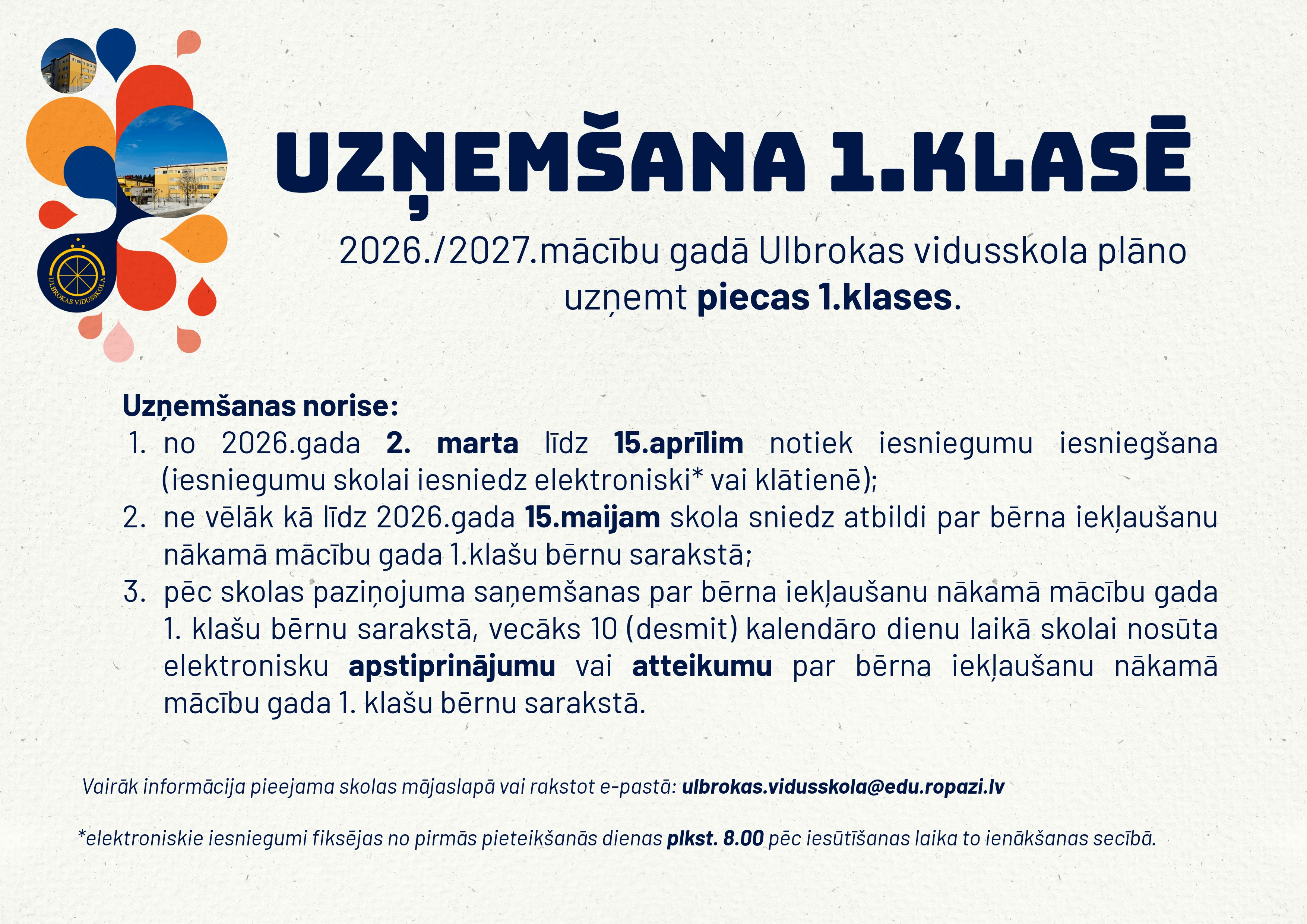 Minētie dokumenti jānosūta uz skolas e-pastu: ulbrokas.vidusskola@edu.ropazi.lv (elektroniskie iesniegumi fiksējas no pirmās pieteikšanās dienas pulksten 8.00 pēc iesūtīšanas laika to ienākšanas secībā).